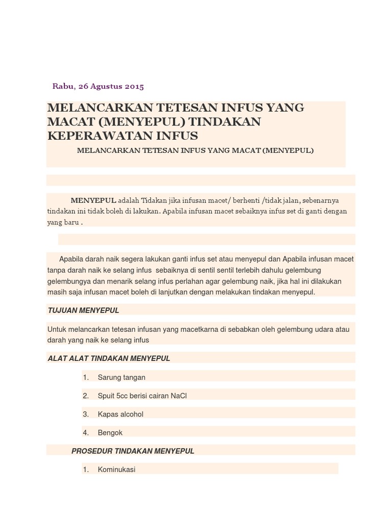 PENYEBAB INFUS MACETTIDAK MENETES DAN CARA MENGATASINYA TANPA SPOOLING 1. Dikatakan mikro karena hanya mampu menampung cairan 60 mm tetes sedangkan kategori makro dapat menampung cairan dari 100 hingga 1000 ml. Aristianto Cuci tangan Hubungkan cairan dan infus set dengan memasukkan ke bagian karet atau akses selang ke botol infuse Isi cairan ke dalam set infus dengan menekan ruang tetesan hingga terisi sebagian dan buka klem slang hingga cairan memenuhi selang dan udara selang keluar Letakkan pangalas di bawah tempat vena yang akan dilakukan.