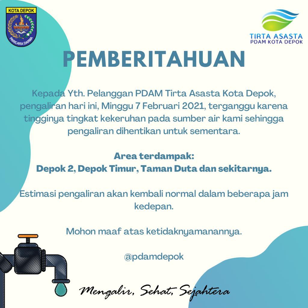 Kepada Yth Pelanggan PDAM Tirta Asasta Kota Depok Dengan ini kami sampaikan rencana penghentian pengaliran yang akan dilaksanakan pada Hari Selasa 13 Desember 2016 pukul 2200 WIB sd Hari Rabu 1. Pemerintahan 2021-02-11 184500 Selengkapnya. DetikNews Sabtu 06 Feb 2021 2137 WIB Mata Meleng Lihat Alun-Alun GDC Pemobil Tabrak Pasutri di Depok.