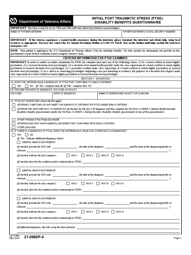 Download your own DBQ form s now for your private doctor to complete. If the veteran has a diagnosis of PTSD VA Form 21-0960P-4 Initial PTSD Disability Benefits Questionnaire must be completed by a VHA staff or contract. How To Incorporate Federal Records With Your VA Claim.